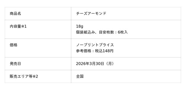 三幸製菓株式会社(本社:新潟県新潟市北区)は、2025年11月よりコンビニエンスストア限定で販売し好評をいただいた食べきりサイズの「18g チーズアーモンド」を、2026年3月30日(月)より全国発売いたします。