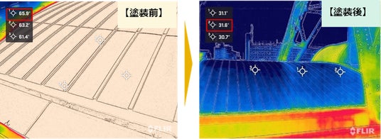 ▲塗装前後における屋根表面温度測定状況(サーモカメラ)