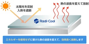 従来の高い日射反射の技術に加え、高い放熱技術を複合することにより製品表面への蓄熱を防ぎ、なおかつ裏面の熱も吸収、放射を可能とすることで、ゼロエネルギーでのエネルギー効率の向上と快適な室内環境の確保を同時に実現した素材です。