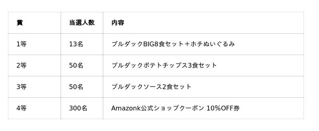 本キャンペーンでは、SNSを通じてブルダックブランドの魅力を体験できる企画を展開します。抽選でブルダック炒め麺詰め合わせセットや限定ノベルティの他、ECショップクーポンが当たるなどブルダック商品をお得に購入できる機会を提供します。