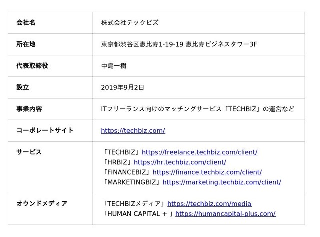 テックビズは「働き方を変え、世界を変えていく」をスローガンに掲げ、国内最大級のITフリーランス向けエージェント「TECHBIZ」を運営しています。近年ではマーケティング、人事、財務経理といったビジネス職のフリーランスと企業をマッチングするサービスにも事業領域を拡大しております。