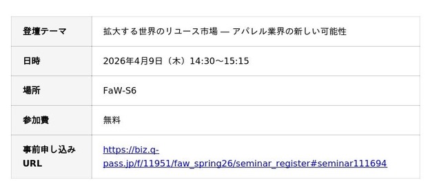あわせて、4月9日(木)には代表取締役・大久保裕史が特別セミナー「拡大する世界のリユース市場 ― アパレル業界の新しい可能性」に登壇します。