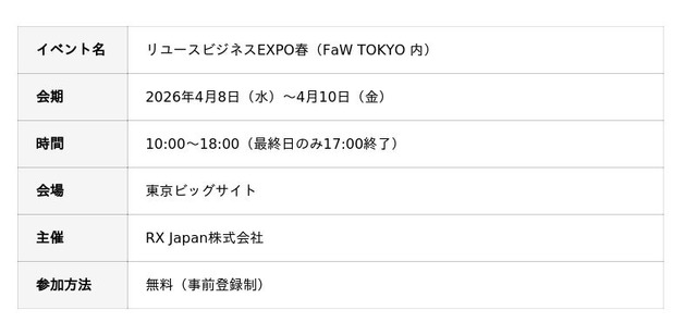 本イベントは、日本最大級のファッションビジネス展「FaW TOKYO 第29回ファッションワールド東京 春」における展示会の1つであり、買取やEC、物流など、リユース事業に必要なサービスを提供する企業が多数出展しており、業界内でも注目されています。