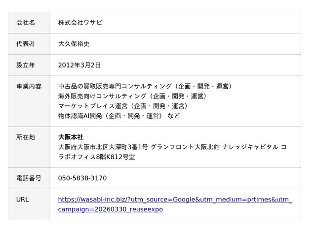 こうした市場の動きを背景に、「日本 × リユース × テクノロジー」を事業の柱に据える株式会社ワサビ(本社:大阪府大阪市、代表取締役:大久保裕史)は、2026年4月8日(水)~4月10日(金)に東京ビッグサイトで開催される「リユースビジネスEXPO春」に登壇・出展します。ブースでは弊社提供サービスの「WASABI SWITCH(以下:ワサビスイッチ)」「WASAVIVA(以下:ワサビバ)」を紹介します。