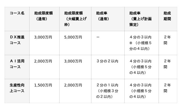 本事業は全4つのコースがあり、この度、DX推進を後押しする2つのコースと、先進的なAI活用の事例創出を目指すコースについて、支援企業の募集を開始しますのでお知らせします。