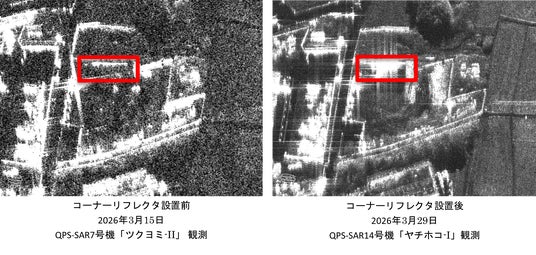 リフレクタの設置工事後、複数の衛星による観測機会がある中、2026年3月29日5時52分(日本時間)に商用稼働中のQPS-SAR14号機「ヤチホコ-I」がNITTOCテストフィールドの観測を実施。得られたSAR画像において、コーナーリフレクタの位置、状況(画像の赤で囲った箇所)を確認することができました。