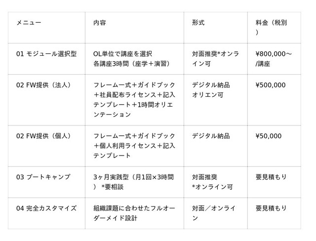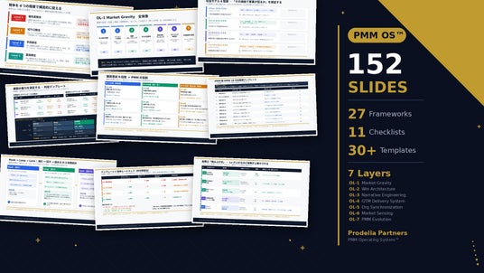 PMM OS(TM)フレームワーク一式(OL-1~7、全152スライド)を組織内共有・自己学習用として提供。法人プラン¥500,000/個人プラン¥50,000(いずれも税別)。フレームワーク単体でのライセンス提供という形態は、PMMフレームワークとして国内で初めての試みです。