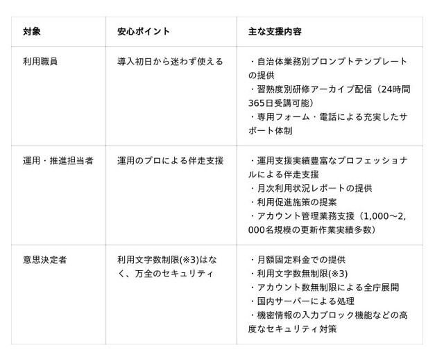 - 使い放題言語モデルを標準搭載:文字数上限を気にせず、全職員の積極的なAI活用を促進(※3)