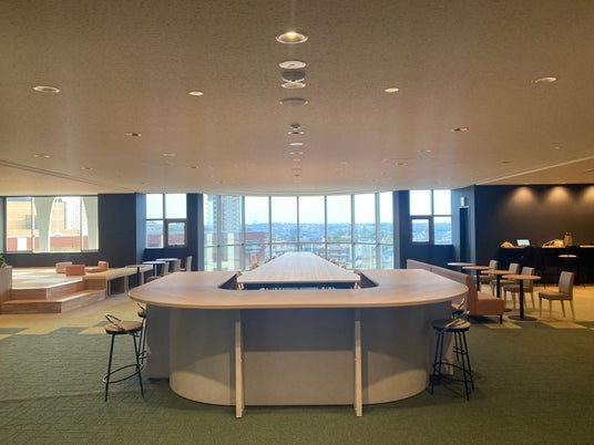 完成した6Fラウンジは、センタービルの眺望を活かしながら、学生の多様な過ごし方に応える空間として設計されています。中央には人が自然と集まるシンボリックな共有テーブルを配置し、その周囲に段差や素材の切り替えを用いたエリアを展開することで、活動の重なりや広がりを感じられる構成としました。また、床や家具の配置によりゆるやかに空間を分節することで、集中・交流・休憩といった異なる行動が同時に成立しながらも、互いの気配を感じられる設計としています。