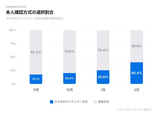 また、現在では口座開設時にスマホのマイナンバーによる本人確認を選択するユーザーの割合が、従来のJPKI方式を上回っており、ユーザー自身がより便利な手段を積極的に選択していることが分かります。