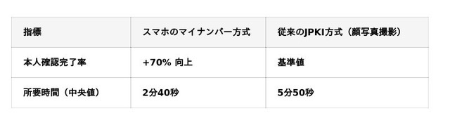 口座開設フローにおける本人確認の完了率(コンバージョン率)を比較したところ、スマホのマイナンバー方式は従来のJPKI方式と比べて約70%の改善が確認されました。従来方式では、顔写真の撮影や