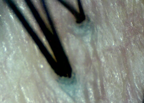 髪(毛幹)が皮膚の奥から生えているのが透けて確認できるのが目安。