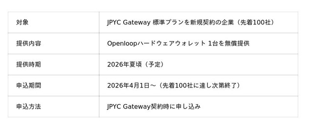 - JPYC Gatewayの提供開始キャンペーンとして、先着100社にOpenloopを無償提供。
