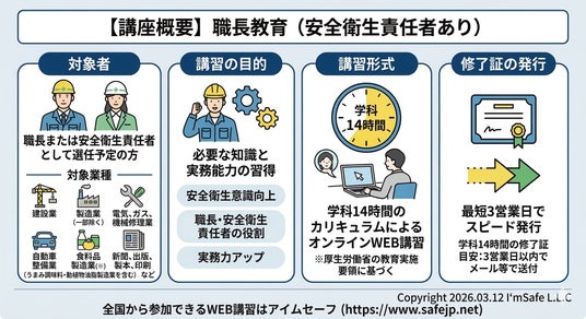 建設業、製造業(一部除く)、電気、ガス、機械修理業、自動車整備業、食料品製造業(うまみ調味料製造業及び動植物油脂製造業は、すでに対象)」、「新聞業、出版業、製本業及び印刷物加工業」など教育が必要な業種の選任される予定の方対象と、安全衛生責任者の選任される予定の方対象に、必要な知識と実務能力を習得していただくため、学科14時間のカリキュラムによる講習です。