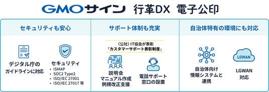 「GMOサイン電子公印」の正式導入にあたっては、電子契約サービス「GMOサイン」の利用を通して、専任担当者が導入・利用・定着まで伴走する「導入支援」サポートが決め手の一つとなりました。そのほか、大分県が「GMOサイン電子公印」を導入した際の選定ポイントは次の通りです。