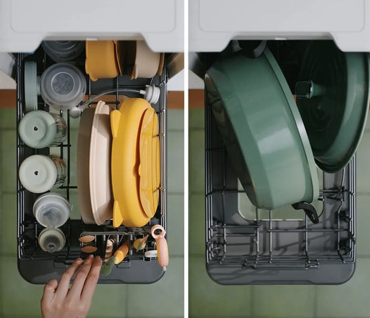 (1)幅28cm、世界最薄レベルのスリムボディに最大22点の食器が入る大容量を両立LISSOME J1は自社従来品よりも幅を約50%もカットできた上、最大22点の食器が一度に片付く大容量を両立させました。庫内の奥行きが約28.7cmと余裕があるため、9号の土鍋(4人分、直径27cm)も洗浄可能に。一人暮らしから3人家族まで、家族形態が変わっても幅広く対応可能なのも魅力の一つ。