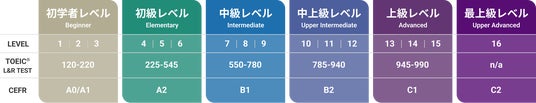 国際基準の言語能力指標「CEFR」を採用し、A1(初心者)からC2(最上級)までをより細分化した全16段階のレベルを設定しています。各レベル修了時には進捗テストを経て修了証明書が発行され、TOEIC(R) L&R TESTなどの主要試験との相関も明確なため、成果を客観的に可視化できます。