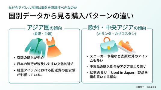 また、国や地域ごとの需要特性に応じた戦略も必要となります。例えば欧米ではメンズ商材やコレクション性の高い商品、アジアでは普段着など実用性の高い商品が支持される傾向がみられました。