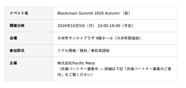 株式会社Pacific Meta(本社:東京都港区、代表取締役社長:岩崎 翔太、以下「当社」)は、2026年10月5日(月)に、ブロックチェーンに関する国際カンファレンス「Blockchain Summit 2026 Autumn (仮)」を大手町サンケイプラザ(東京都千代田区)にて開催することをお知らせいたします。
