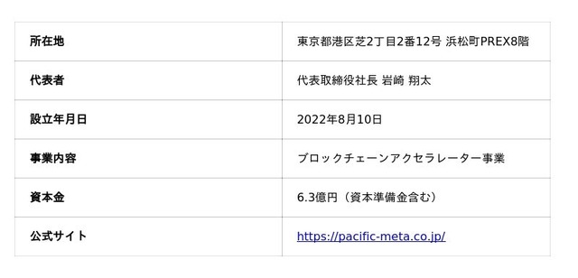 Pacific Metaは、事業戦略の立案からトークン設計、資金調達、マーケティングまで、ブロックチェーン事業の立ち上げと運営を包括的に支援しています。創業から3年で160件以上のプロジェクトを支援し、国内外41カ国以上のプロジェクトに携わるグローバルチームとして、日本発・海外発の双方からビジネスの展開をサポートしています。ブロックチェーンやトークンを活用した事業が、社会実装へと迅速に到達できるよう、人材・ノウハウ・ネットワーク・投資のあらゆる側面から伴走しています。会社概要