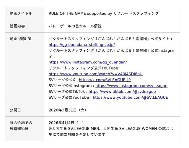リクルートスタッフィングは、本動画を通じてバレーボールの魅力に触れる機会を創出し、試合観戦やチームへの応援がより一層活発になることを目指すSVリーグの取り組みに賛同し、タイトルパートナーとして協賛することを決定しました。