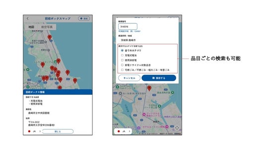 資源回収マップ機能の画面。市内の回収拠点と受け入れ品目をマップ上で一覧表示。