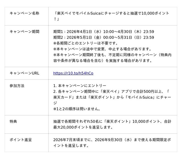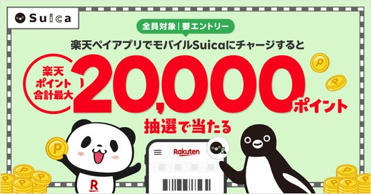 本キャンペーンでは、エントリーのうえ、キャンペーン期間中に「楽天ペイ」アプリで合計500円以上を、「楽天カード」または「楽天ポイント」から「モバイルSuica」にチャージした方の中から、抽選で各期間(注1)それぞれ50名に10,000ポイント、合計で最大20,000ポイントの「楽天ポイント」を進呈します。