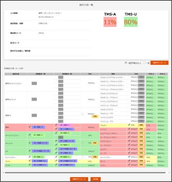 - 複数語からなる結合商標が入力された場合は、分離観察されうる全ての組合せ語を網羅的に抽出したうえで、組合せ語毎に詳細に分析を行い、TMR(※2)やTMC(※3)といった各種指標を算出し、最終的な総合指標であるTMS(※4)をAIが算出する