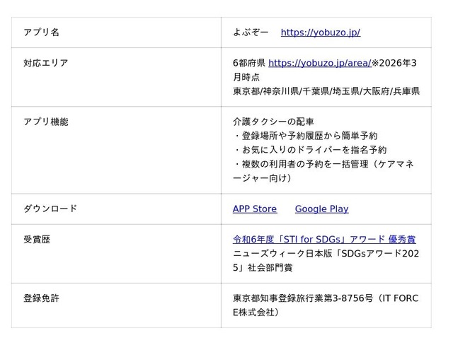 IT FORCE株式会社(本社:東京都中央区、代表取締役社長:陰山 光孝)が提供する介護タクシー予約アプリ『よぶぞー』は、一般社団法人福祉移送ネットワーク アイラス(以下、アイラス)との協業を2026年4月1日から開始します。介護タクシーの予約の際に、アイラス加盟事業者に専用の表記をすることで、利用者は優良事業者を選定しやすくなります。協業により、『よぶぞー』への登録事業者は約200社増加し、介護タクシーの予約確保がより容易になります。今回の協業を通して、介護タクシー業界のさらなる発展に貢献します。
