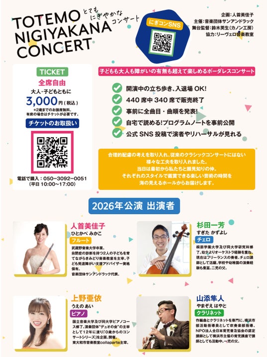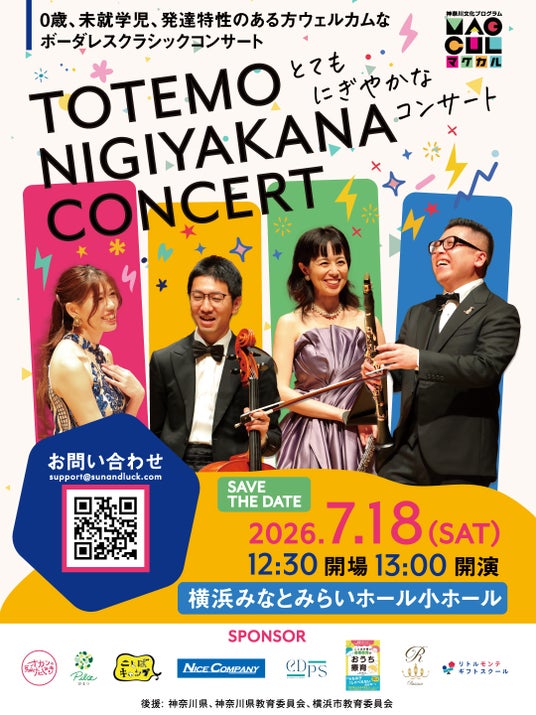 音楽団体サンアンドラック主催、『とてもにぎやかなコンサート』が2026年7月18日(土)に横浜みなとみらいホール 小ホール(神奈川県横浜市西区みなとみらい2-3-6)にて上演されます。チケットはカンフェティ(運営:ロングランプランニング株式会社、東京都新宿区、代表取締役:榑松 大剛)にて発売中です。