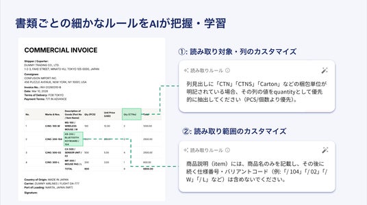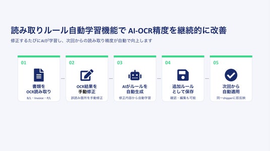 これまではこうした細かな違いは人が手作業で修正せざるを得ませんでしたが、今回の「読み取りルール自動学習機能」により、AIが「この書類のときは、こう読み取る」という独自のルールを自動で学習・生成することが可能となります。