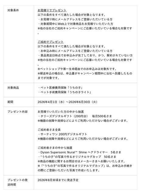 本キャンペーンは、社名変更を記念して、期間中にペット保険の新規お見積り・お申込みをいただいた皆さまに景品をプレゼントします。Webでお見積りいただいた方には抽選で毎月500名さまに「タリーズデジタルギフト(200円分)」が当たるほか、ご成約者さま全員には「サーティワン 200円デジタルギフト」をプレゼントします。さらに、ご成約者さまの中から抽選で合計55名さまに豪華景品が当たります。5名さまには最新のヘアドライヤー、50名さまには世界で1つだけの“うちの子”の写真で作るオリジナルマグカップをプレゼントします。
