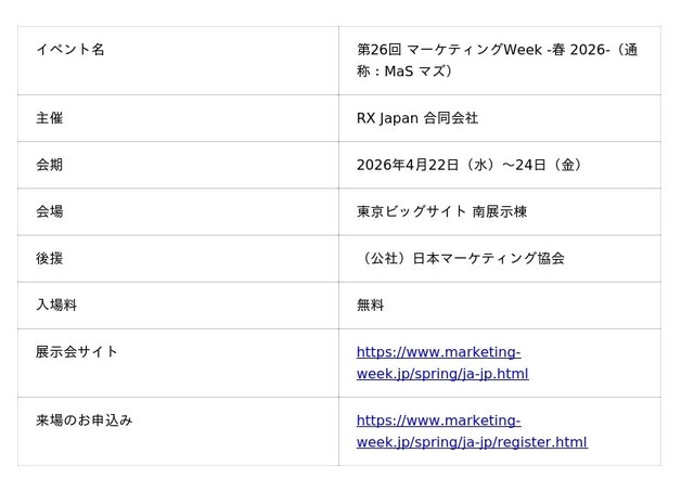 2026年4月22日(水)~24日(金)に東京ビッグサイトで開催される、国内最大規模のマーケ全領域展示会です。約300企業が一堂に会し、約20,000名のビジネスパーソンの来場が見込まれています。広告コストの高騰、クッキー規制、AI活用の加速など、マーケティング環境は大きな転換期を迎え、企業には、より高度な戦略設計と実装力が求められています。本展では、こうした時代背景に応える最新ソリューションが一堂に会します。