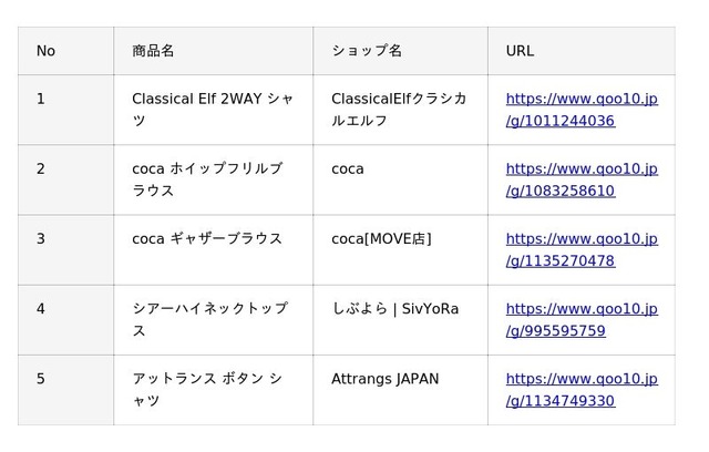 Qoo10「シャツ・ブラウス」人気ランキング