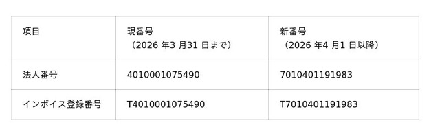 2026年4月1日以降、当社との取引にかかる各種番号が以下の通り変更となります。お手数をおかけし誠に恐縮ですが、お手元の情報の更新をお願い申し上げます。