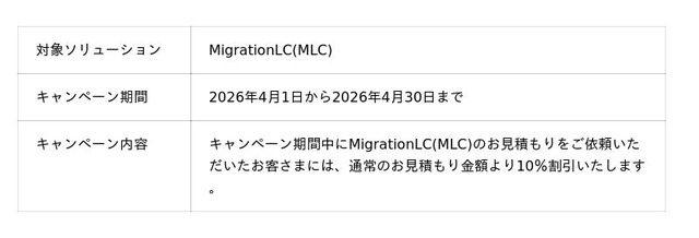 サービス提供開始を機に、より多くのお客さまに「MigrationLC(MLC)」を知っていただき、具体的な検討を進めていただくため、今回の記念キャンペーンを実施します。