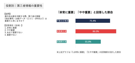 第三者情報の重要性については、予算決定権者の75.4%、展示会運営の実務責任者の86.0%が「重要」「やや重要」と回答しました。