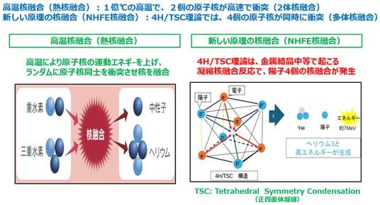 通常の核融合反応は、高温(一億度以上)が必要です。また、これらの反応を実現するため大規模な設備も必要で、設備の価格も高価(数兆円)です。ここで紹介する新しい原理の核融合は1,000℃以下でも反応するため、設備も小型化でき、放射能も検出されないため、環境に優しい未来の新エネルギーであると確信しています。