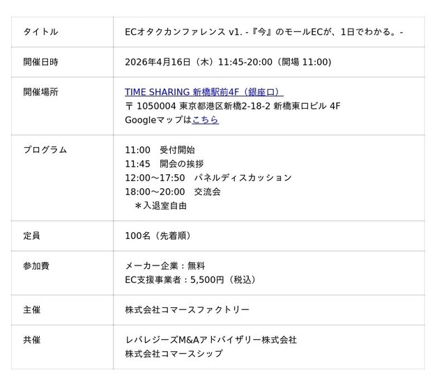 EC支援事業を展開する株式会社コマースファクトリー(本社:東京都港区/代表取締役:岡本駿平)は、モールECの最新戦略を1日で学べるリアルカンファレンス「ECオタクカンファレンスv1. -『今』のモールECが、1日でわかる。-」を、2026年4月16日(木)に東京都内で開催いたします。