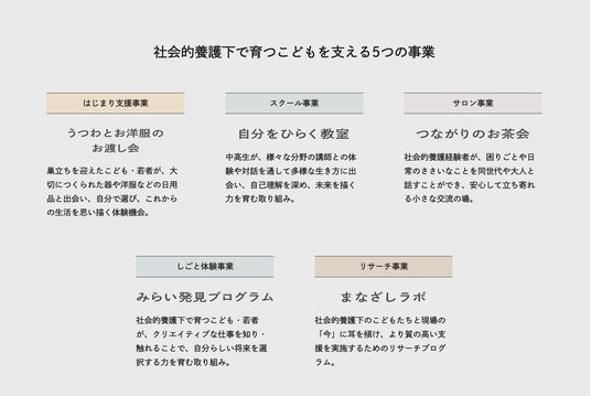 社会的養護の現場では、日々こどもたちの成長を支え自立に向けた支援が行われていますが、集団生活の運営や予算上の制約などから、習い事や旅行など、個々の興味関心に応じて多様な価値観や社会との出会いを広げることが難しい現状があります。こうした体験機会の不足が、主体的な進路選択や働き方、暮らし方を思い描く力や「やってみよう」と踏み出す意欲を停滞させてしまうことがあります。