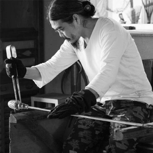 東京で生まれ千葉に育ち岡山で生涯を仕える人と事に出会い、工藝の道へ。ちょっといい普通なガラスの器を目指して制作している。2021年に日本民藝館展にて最高賞である日本民藝館賞を受賞。2009年から町内学童保育にコップを送る活動を始めて2011年「手の長いおじさんプロジェクト」を立ち上げる。