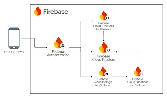 Firebaseによる認証・データ管理・処理連携のクラウド構成図