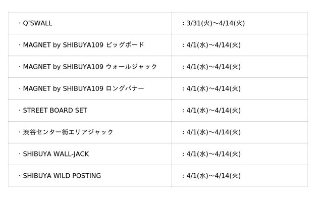 掲出場所一覧: Q's WALL、MAGNET by SHIBUYA109 ビッグボード、STREET BOARD SET、渋谷センター街エリアジャック、SHIBUYA WALL-JACK、SHIBUYA WILD POSTING、他