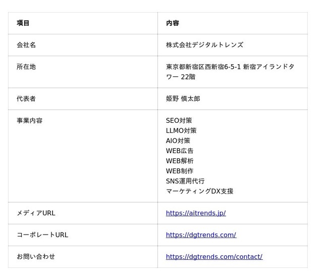 本メディアは、SEO対策をはじめ、広告運用・LLMO対策・WEB解析などWebマーケティング領域で複数の事業部を持つ株式会社デジタルトレンズの知見を結集し、各領域の専門家が現場で使えるAI活用術を即実践できる形でお届けします。