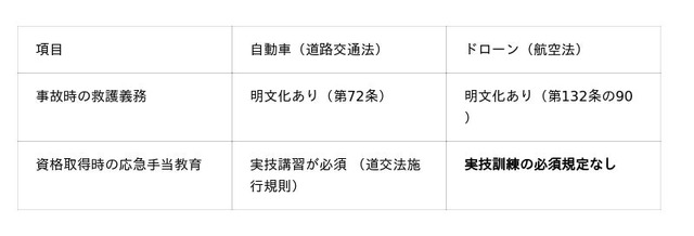 航空法第132条の90は、ドローン運航者に事故発生時の救護措置を義務付けています。違反した場合は罰則の対象となります。一方で、国土交通省が定める登録講習機関(国家資格取得コース)のカリキュラムには、応急手当の実技訓練を必須とする規定が存在しません。「救護義務はある。しかし、学ぶ仕組みがない。」この矛盾がドローン現場の現実です。
