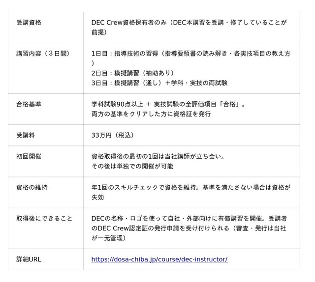 DECインストラクター資格の取得要件は、3日間の専門プログラム受講に加え、学科試験90点以上・実技試験の全評価項目合格という明確な基準を設けています。さらに資格取得後の初回開催は当社講師が立ち会い、年1回のスキルチェックで資格を維持する仕組みです。DECの品質を担保した上で、講習の担い手を広げることが本制度の目的です。