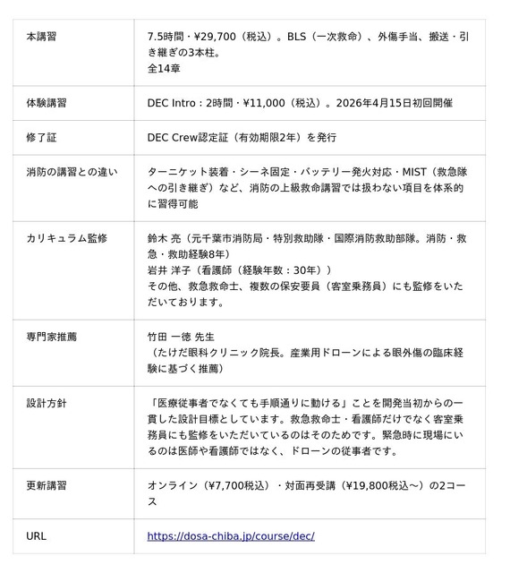 DECは、ドローン運航現場で起こりうる外傷・心停止・熱傷・環境障害に対し、救急隊に引き継ぐまでの初動を習得するプログラムです。開発開始から7年経過、2026年3月にカリキュラムを刷新しました。