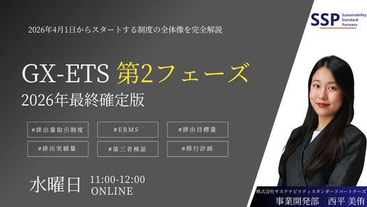 株式会社サステナビリティスタンダードパートナーズ(本社:東京都、以下「SSP」)は、2026年4月1日に施行されたGX-ETS(排出量取引制度)第2フェーズの確定情報と実務対応を解説する無料オンラインセミナー2本を、2026年4月22日(火)より全4回開催いたします。経済産業省が2026年3月31日に公表した公式マニュアルに基づき、制度の全体像を解説する「概要編」と、排出実績量の算定実務を深掘りする「実績量編」の2部構成で、同日午前・午後に受講いただけます。