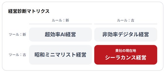 【特長2.】「経営診断マトリクス」で自社の現在地を可視化診断結果では「ツール」×「ルール」の2軸で構成された独自の「経営診断マトリクス」を提示し、自社がどのポジションにいるかを一目で確認できます。