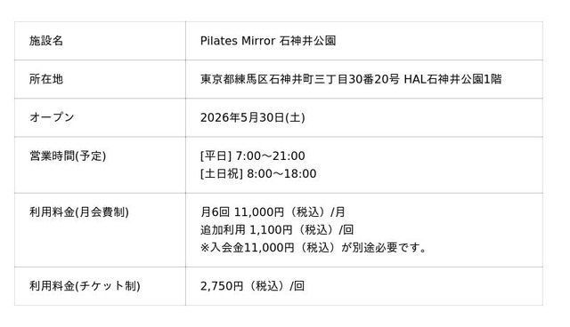 コナミスポーツ株式会社(以下、「弊社」)は、天井にミラーを設置したマシンピラティススタジオ「Pilates Mirror 石神井公園(東京都練馬区)」を2026年5月30日(土)にオープンします。